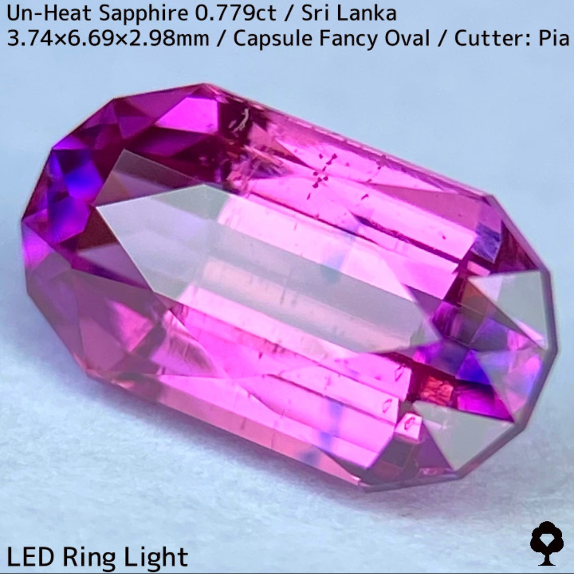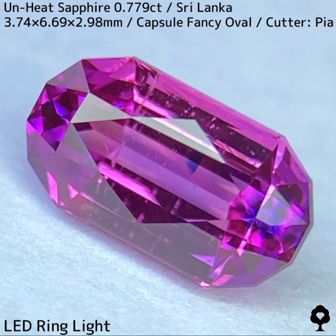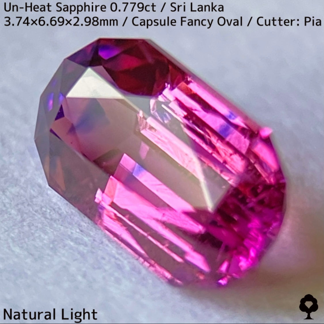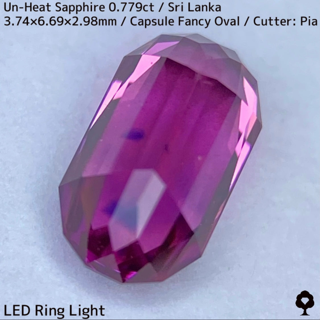 スリランカ産らしい色合いの美しいピンキッシュオレンジーパープルの非加熱サファイアで、2箇所にあるブルーの色だまりがカプセル形のカットの両端に溜まった鮮やかな色にブルーを加えて美しいパープルの煌めきを放ちます。