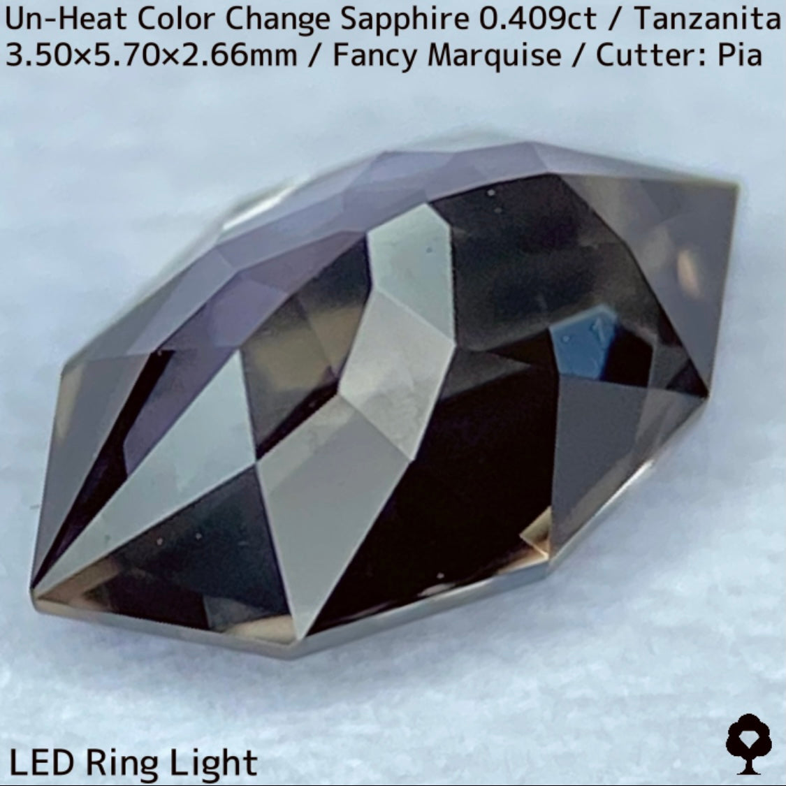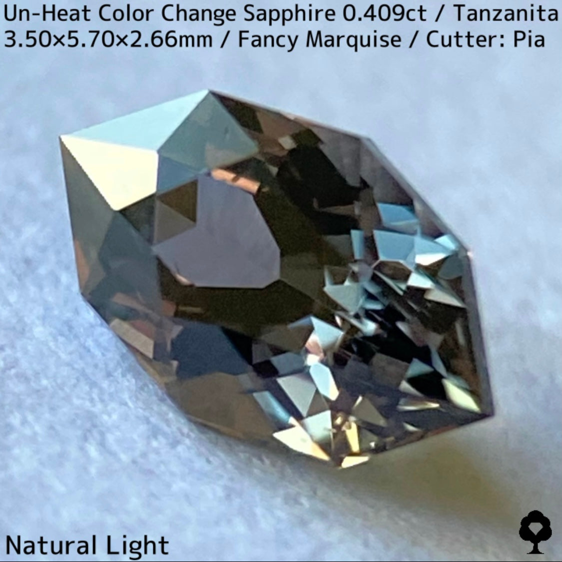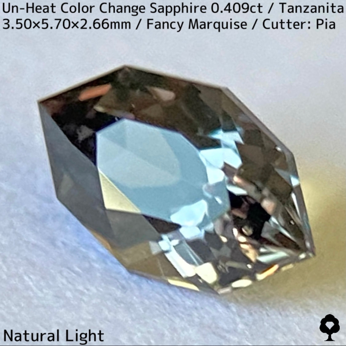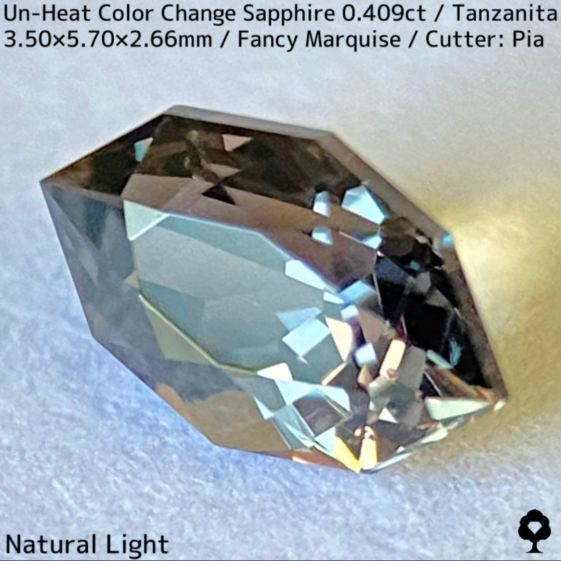 ご好評いただいているチャンタブリーで大御所が箱買いした当たりロットのタンザニア産非加熱カラーチェンジサファイアで、ファンシーオーバルを中心にご紹介を進めて来ましたが、元の石の状態でインクルージョンがあったため、思い切ってファンシーマーキスに仕上げた一石です。