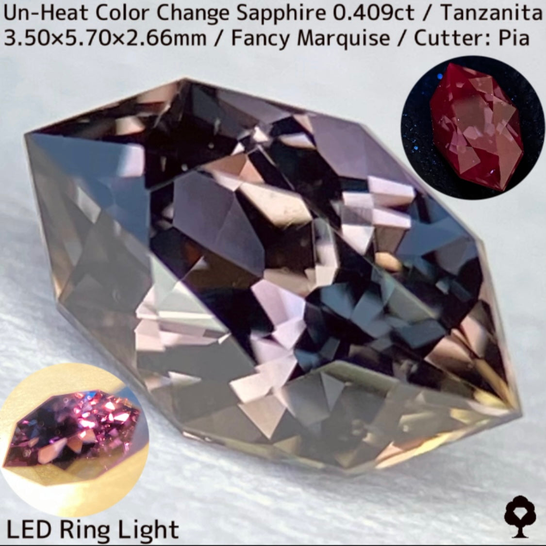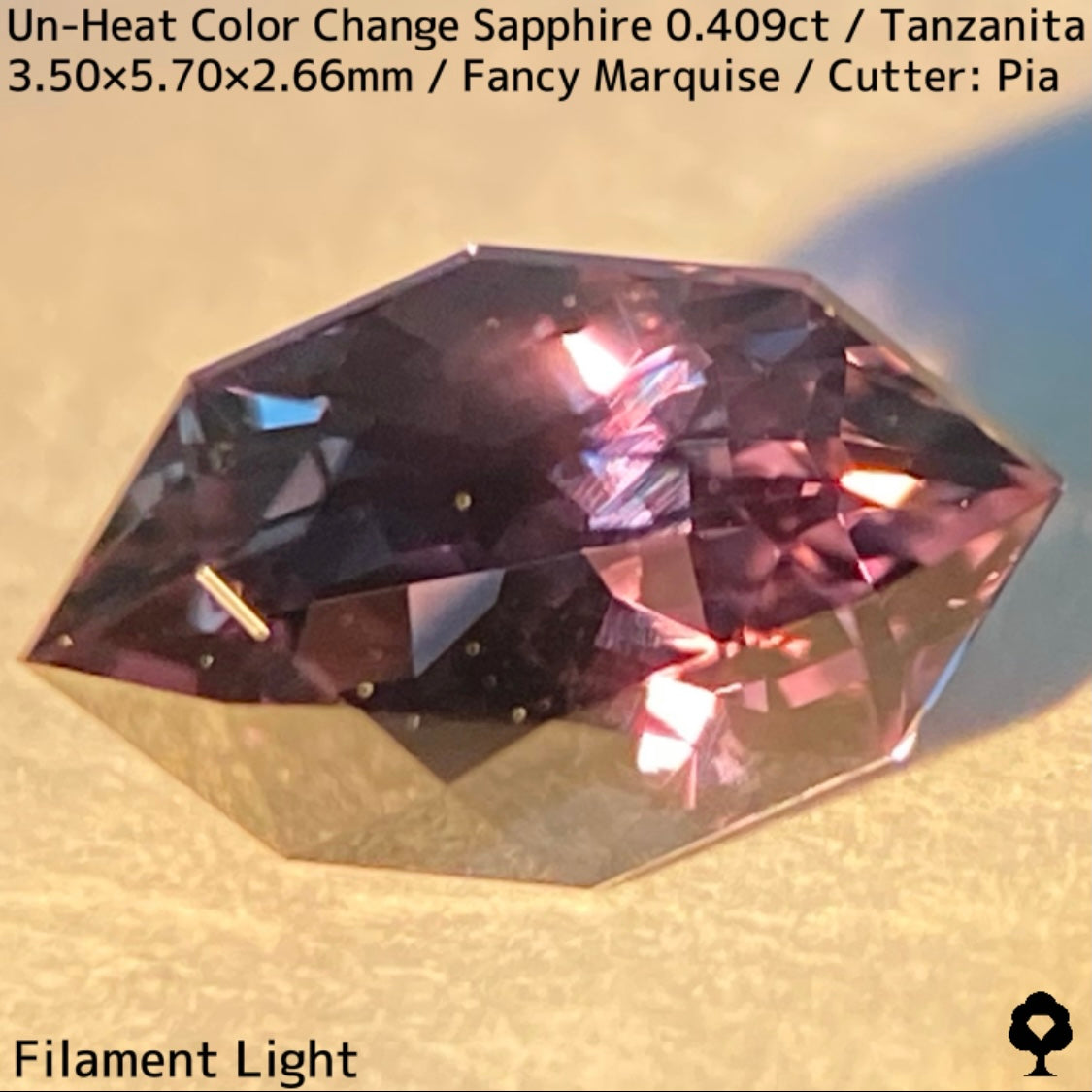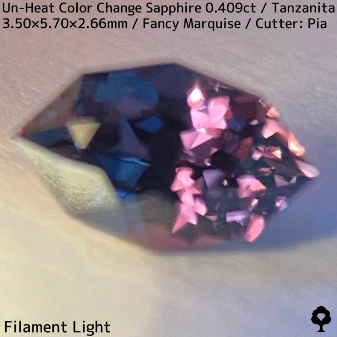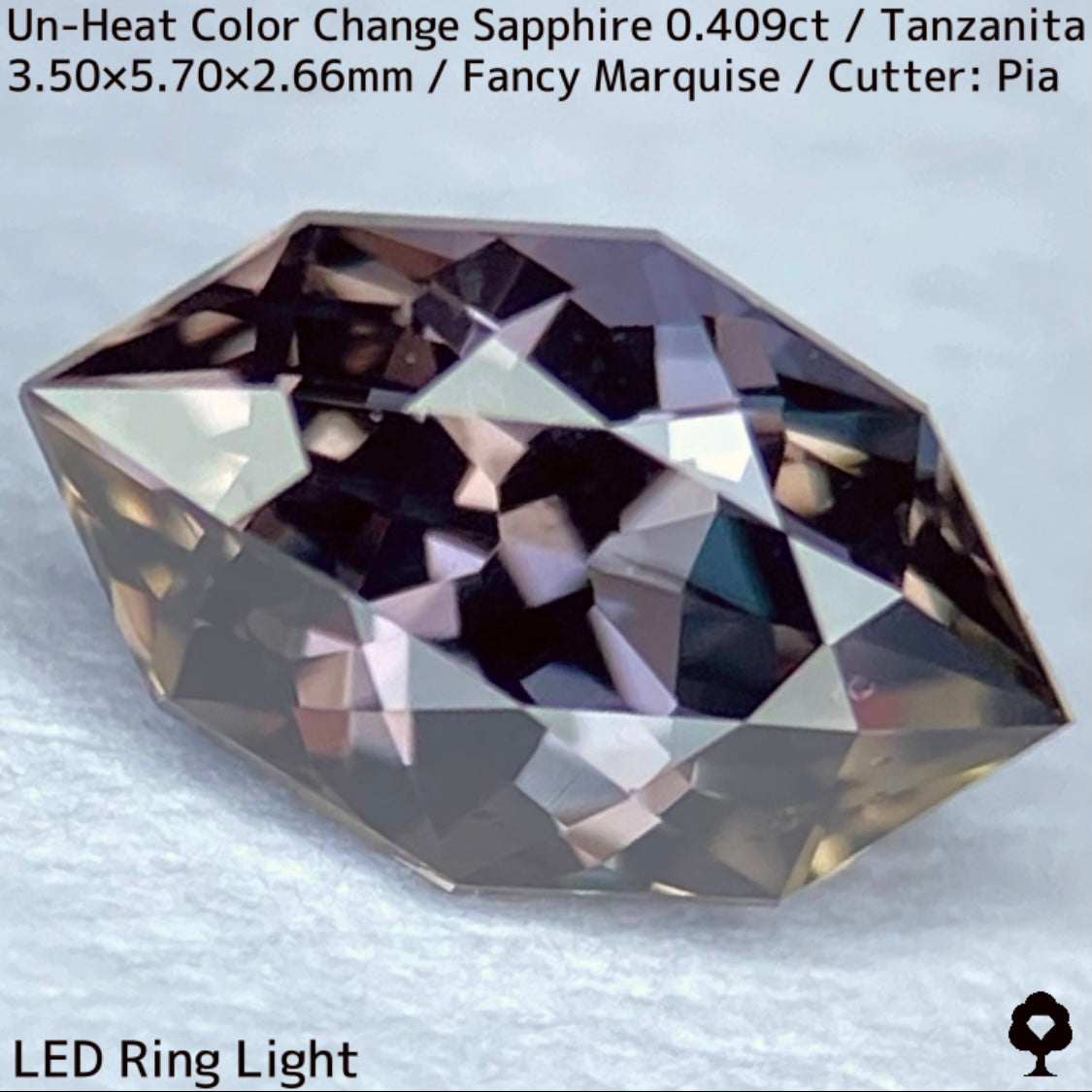 ご好評いただいているチャンタブリーで大御所が箱買いした当たりロットのタンザニア産非加熱カラーチェンジサファイアで、ファンシーオーバルを中心にご紹介を進めて来ましたが、元の石の状態でインクルージョンがあったため、思い切ってファンシーマーキスに仕上げた一石です。