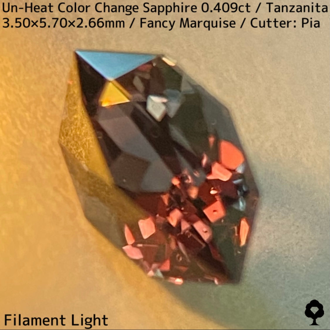 タンザニア産非加熱カラーチェンジサファイア0.409ct★プックリした可愛いファンシーマーキスに仕上げた渋くて可愛い多色感ある地色と煌めき