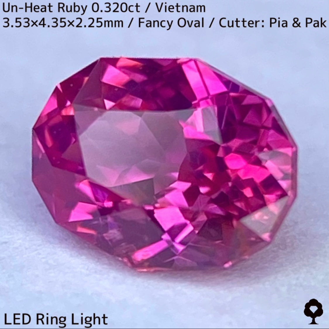 ベトナム産ならではのネオンの強い煌めきを放つ非加熱ルビーで、シルキー感は無く透明度の高い一石で濃厚なラディッシュパープルの地色から、端正なフラワーカットによって細やかな煌めきが溢れる一石です。