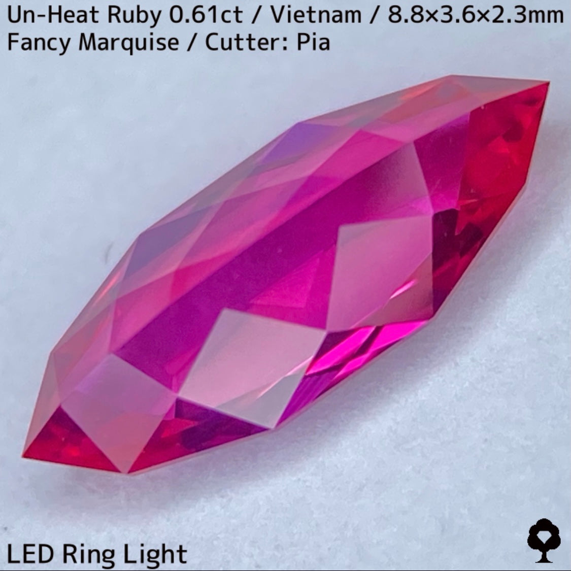 内部を覗き込んでみると、ブルーの僅かな筋がありベトナム産に見られるルビーの中にサファイアが入り込んでいる面白さも持っています。