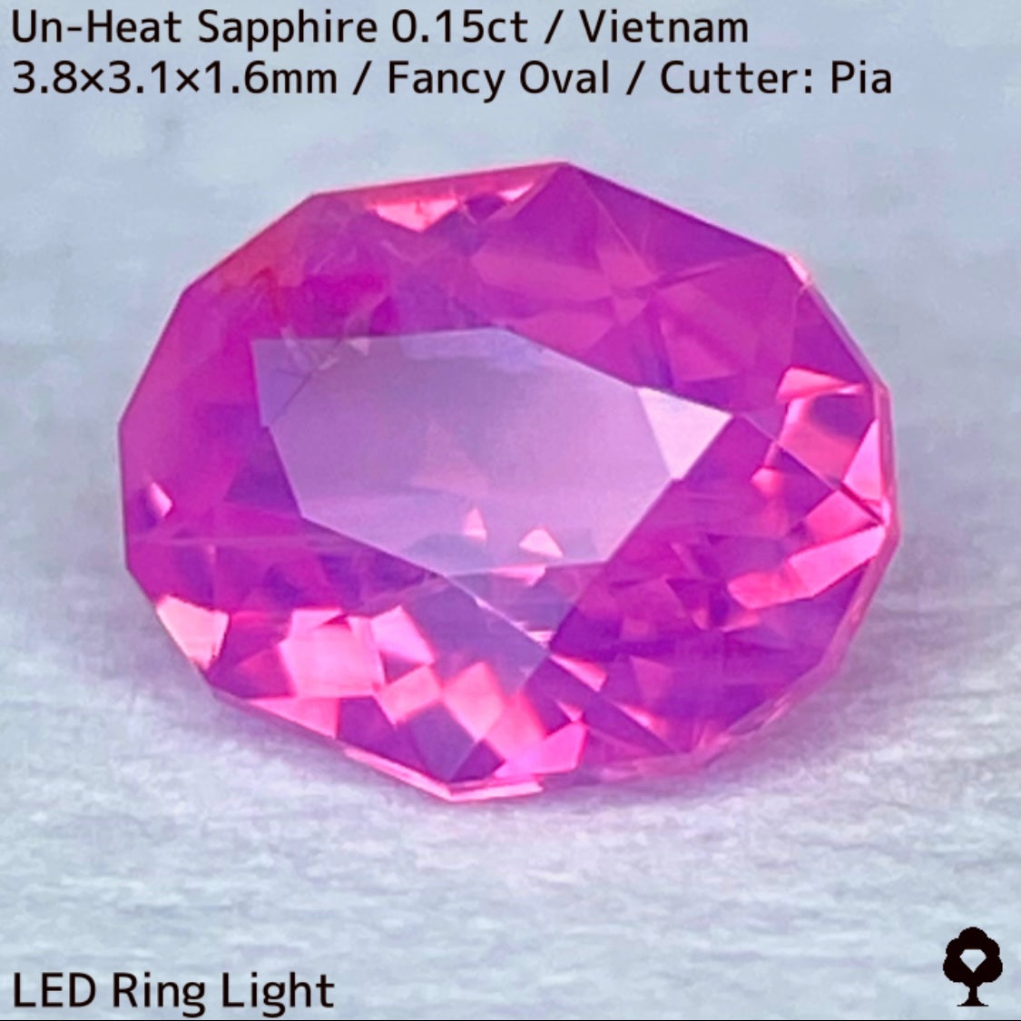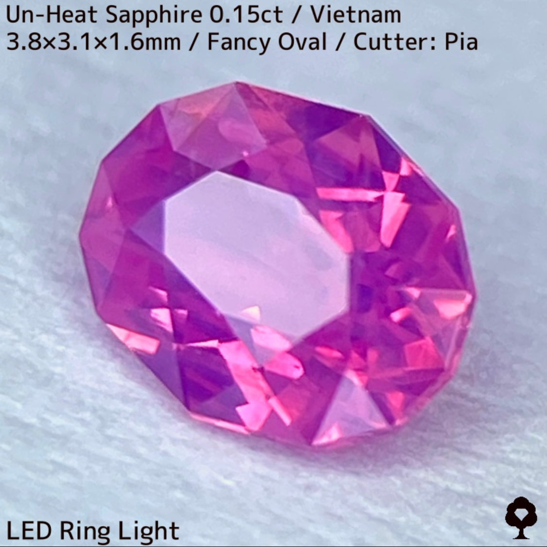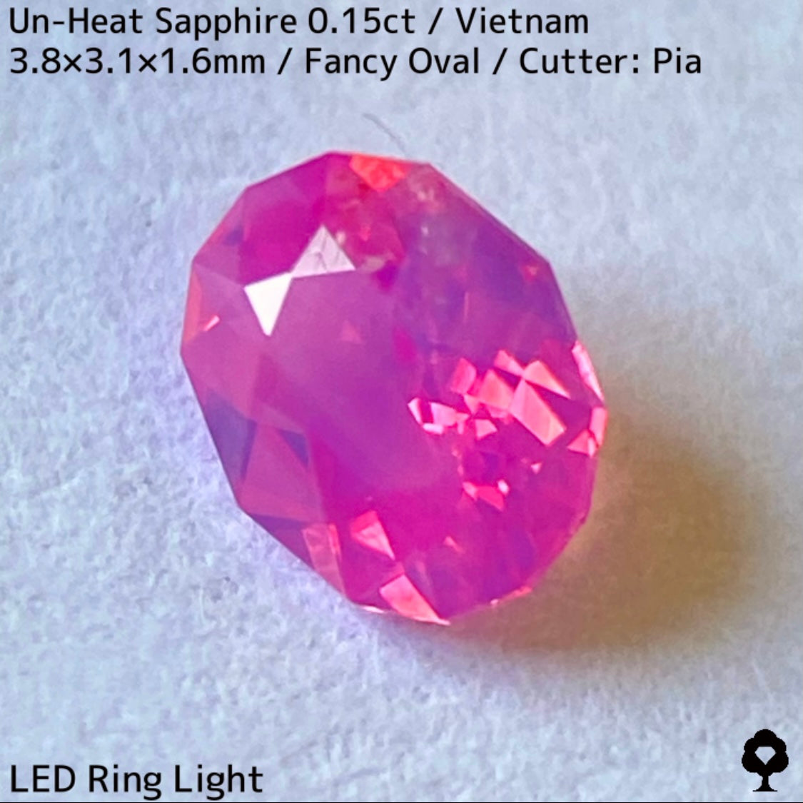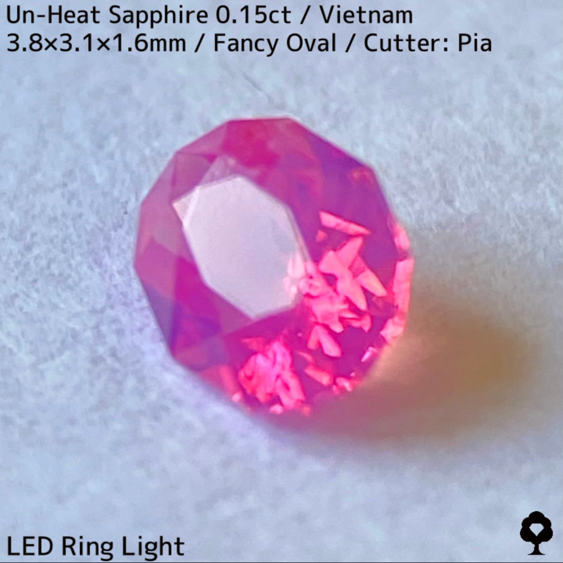 濃厚で濃いシルキーピンクが可愛い一石で、小粒ながらネオンの強い煌めきが楽しめます。クラウン側に内包物の表出はありますが、小粒ということもあって肉眼ではほとんど気にならず、赤オレンジのだまりが色合いの濃さとベトナム産らしさを強めています。