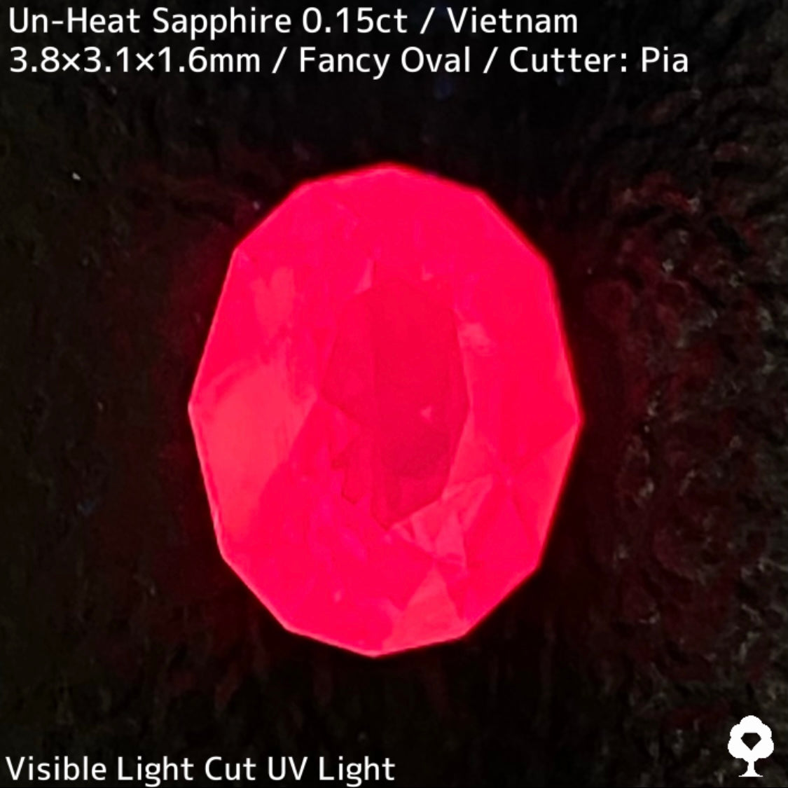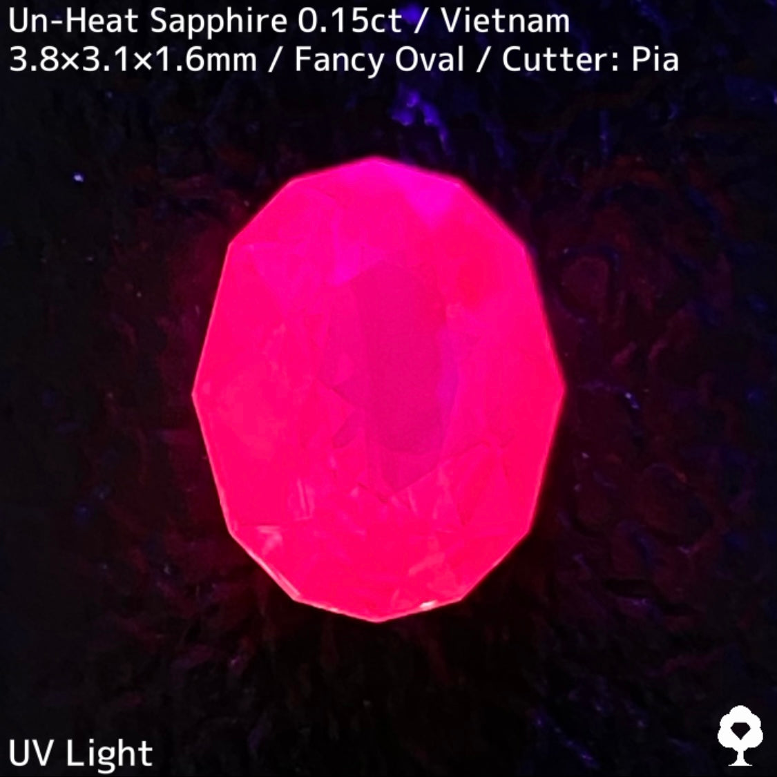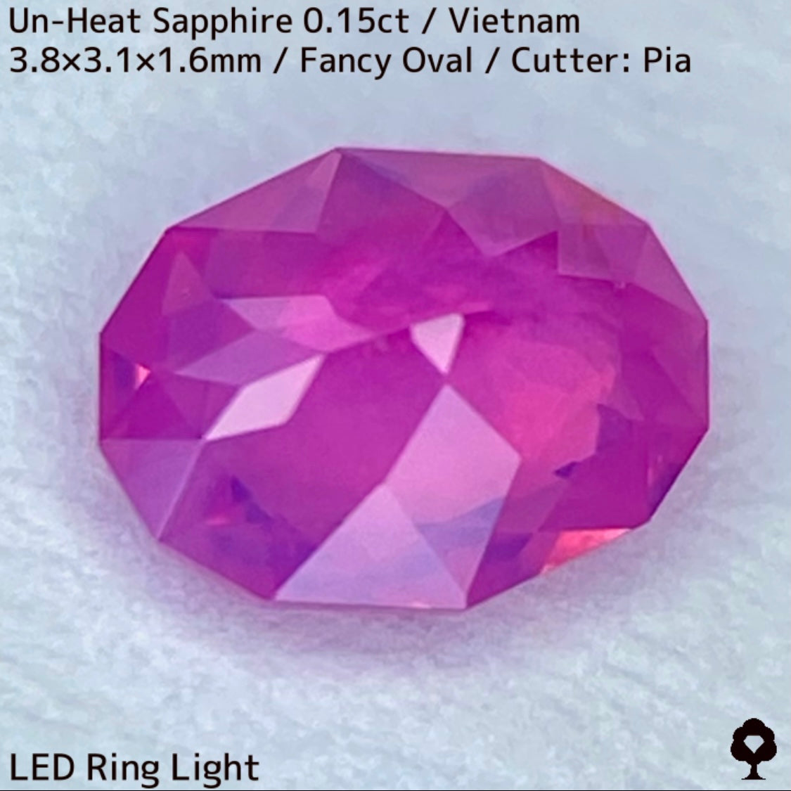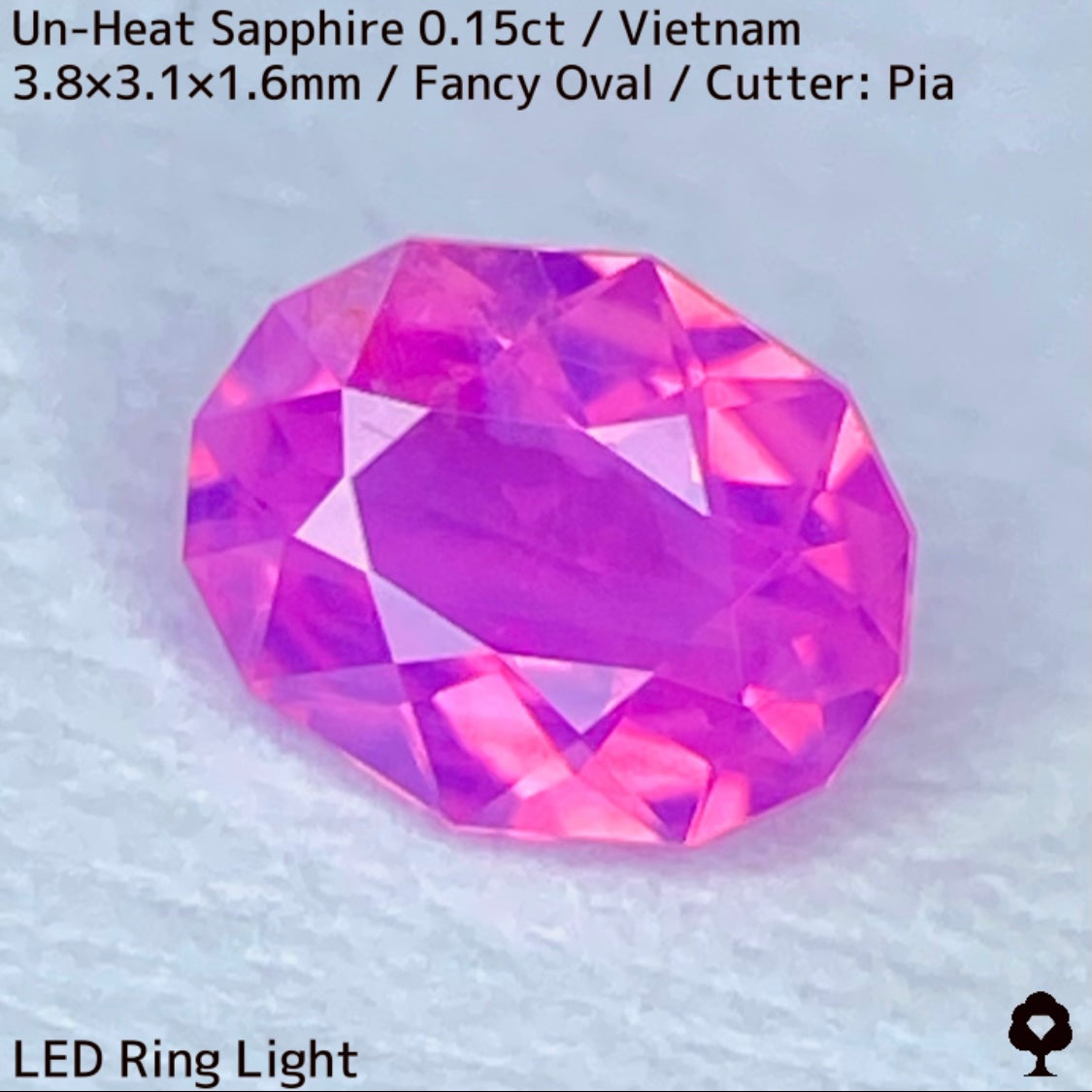 濃厚で濃いシルキーピンクが可愛い一石で、小粒ながらネオンの強い煌めきが楽しめます。クラウン側に内包物の表出はありますが、小粒ということもあって肉眼ではほとんど気にならず、赤オレンジのだまりが色合いの濃さとベトナム産らしさを強めています。