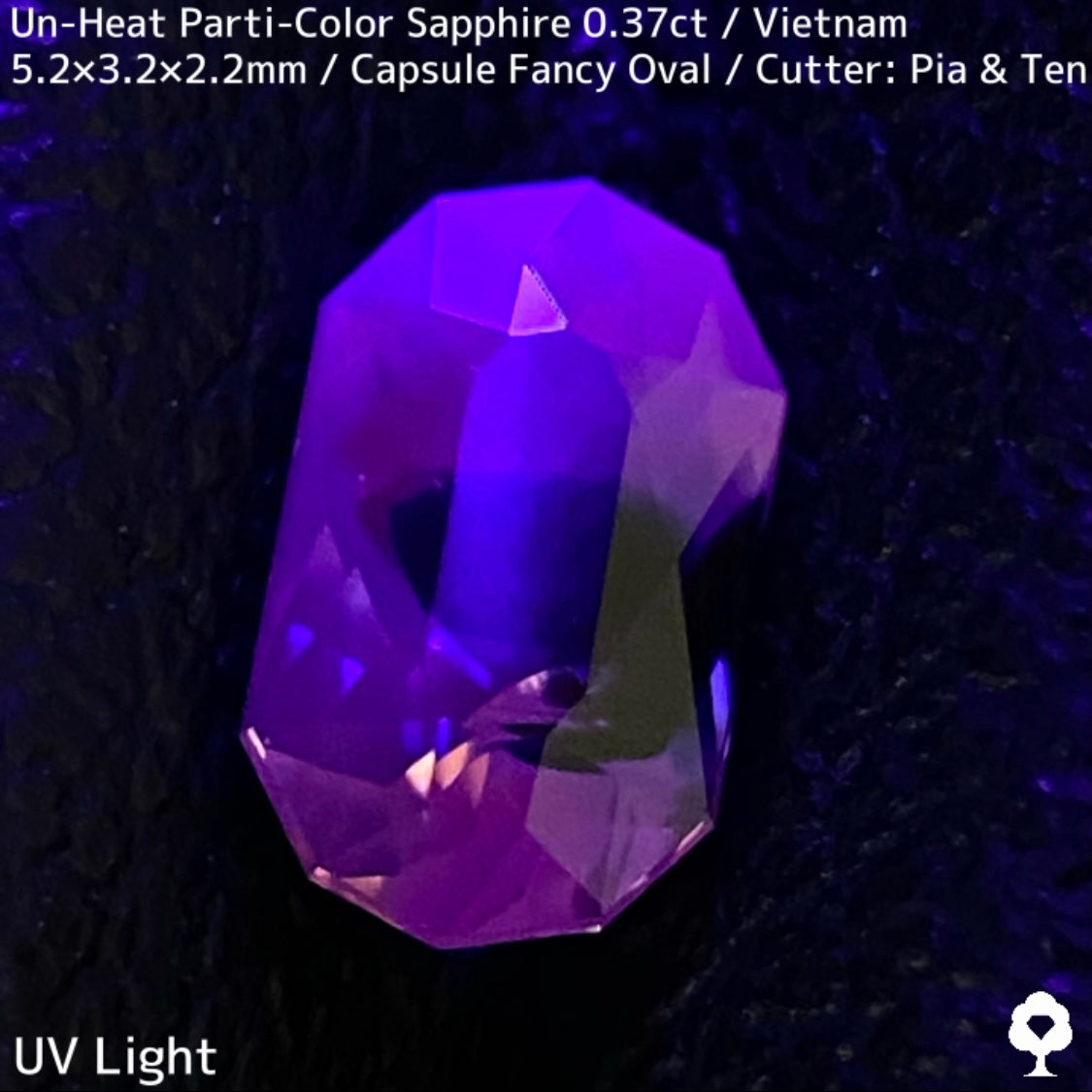 シルキーブルーにパープルやイエローが混ざり合い不透明な濃いブルーの色だまりが中央にあるベトナム産らしい面白さの詰まった非加熱パーティカラーサファイアです。