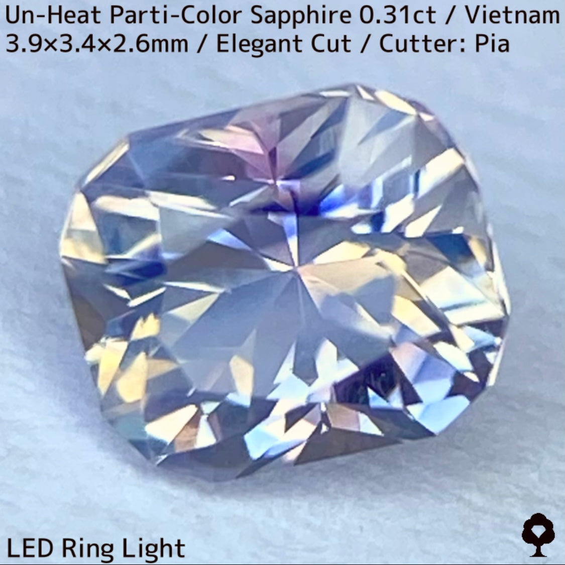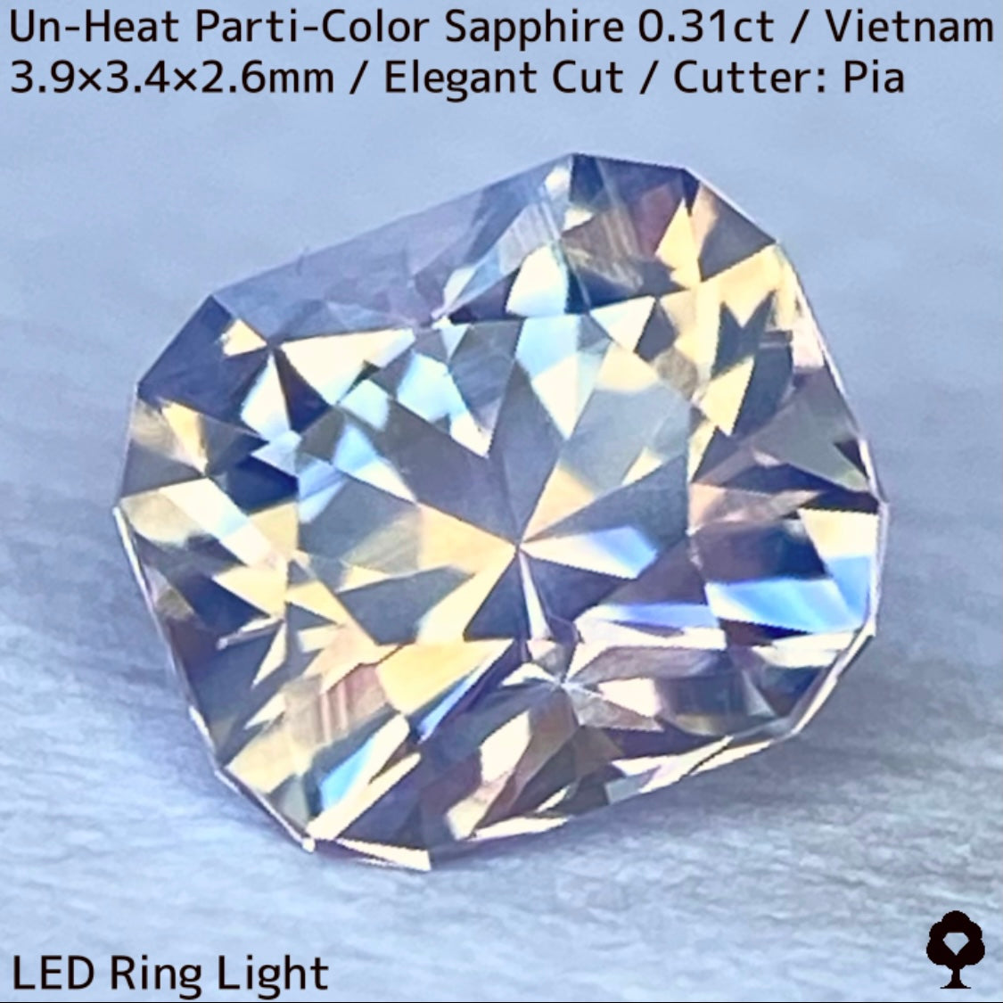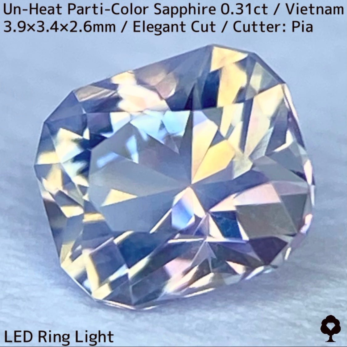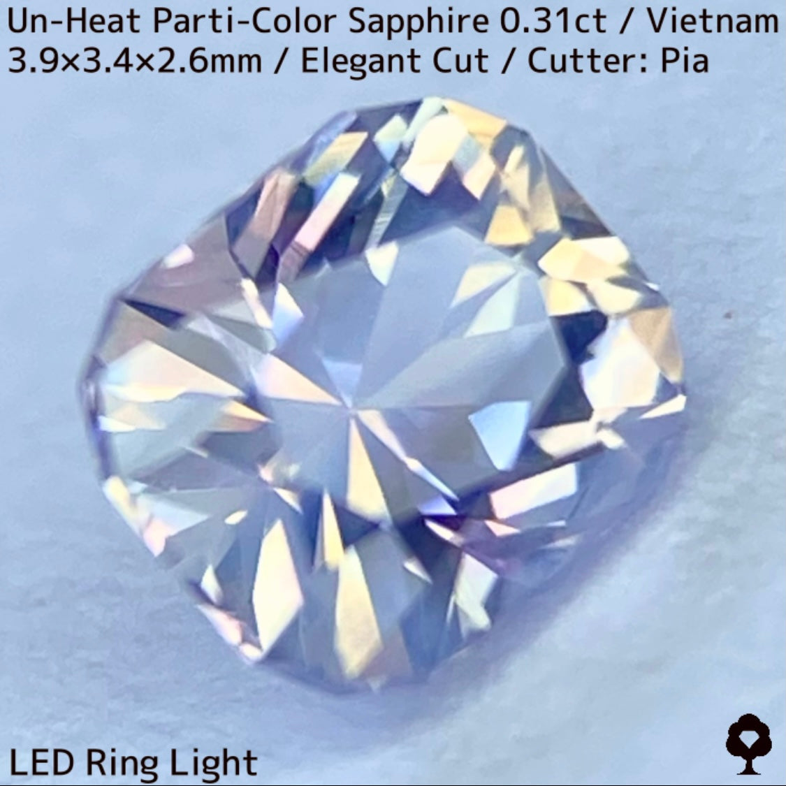 ホワイトとシャンパンゴールドの地色にほんのりピンクの色だまりとブルー横長の色だまり、そしてシルキーな成分が横切る、パステルカラーの可愛らしいベトナム産の非加熱パーティカラーサファイアです。