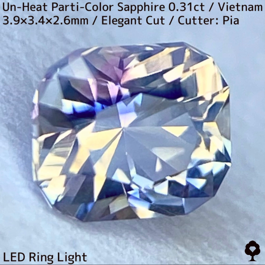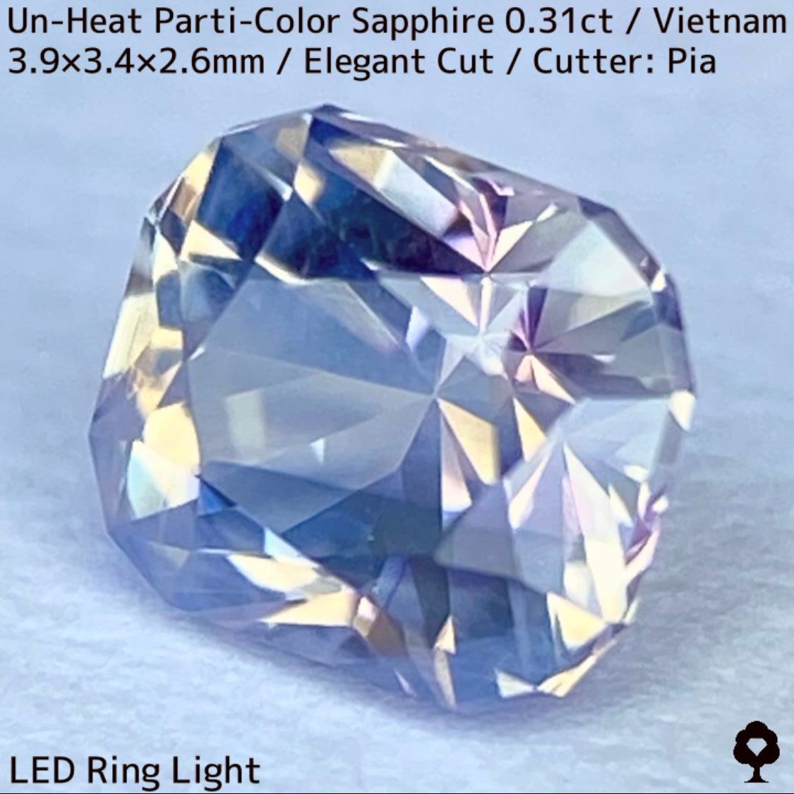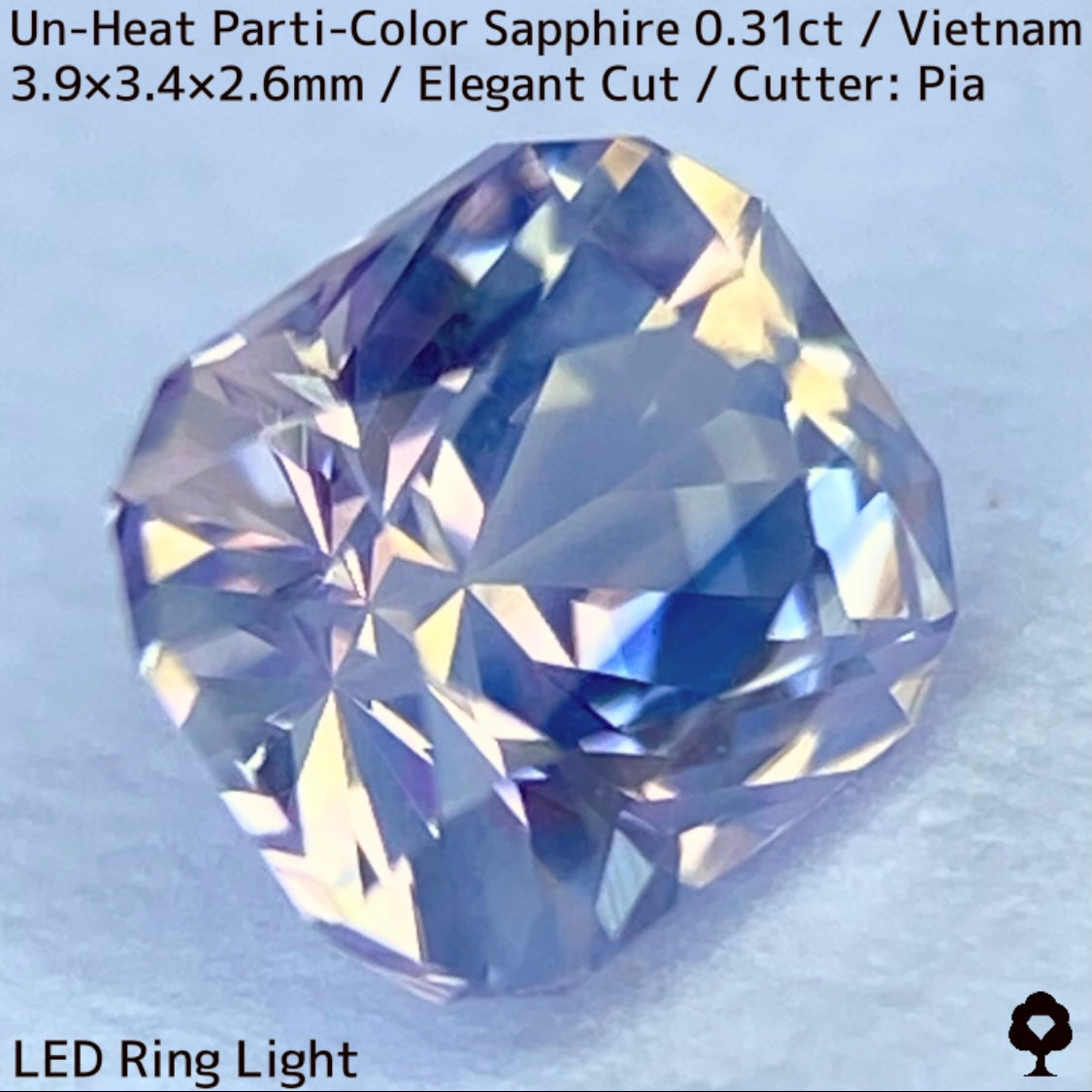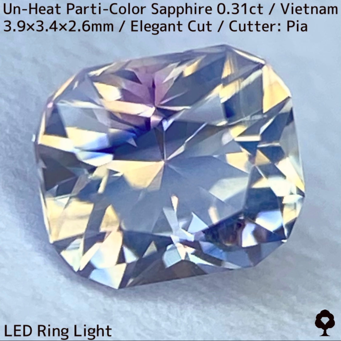ホワイトとシャンパンゴールドの地色にほんのりピンクの色だまりとブルー横長の色だまり、そしてシルキーな成分が横切る、パステルカラーの可愛らしいベトナム産の非加熱パーティカラーサファイアです。