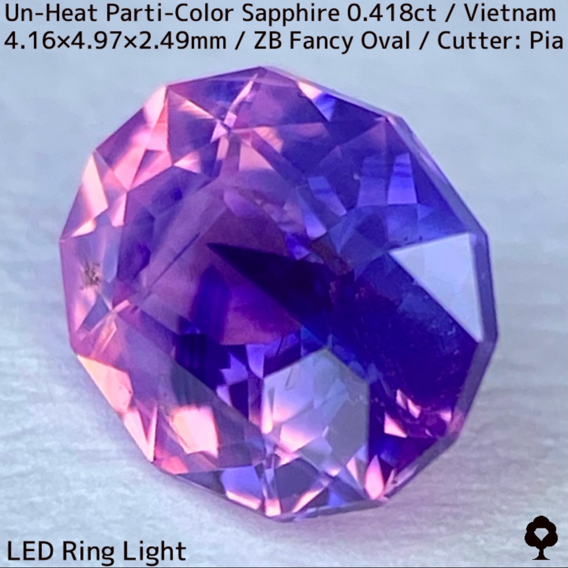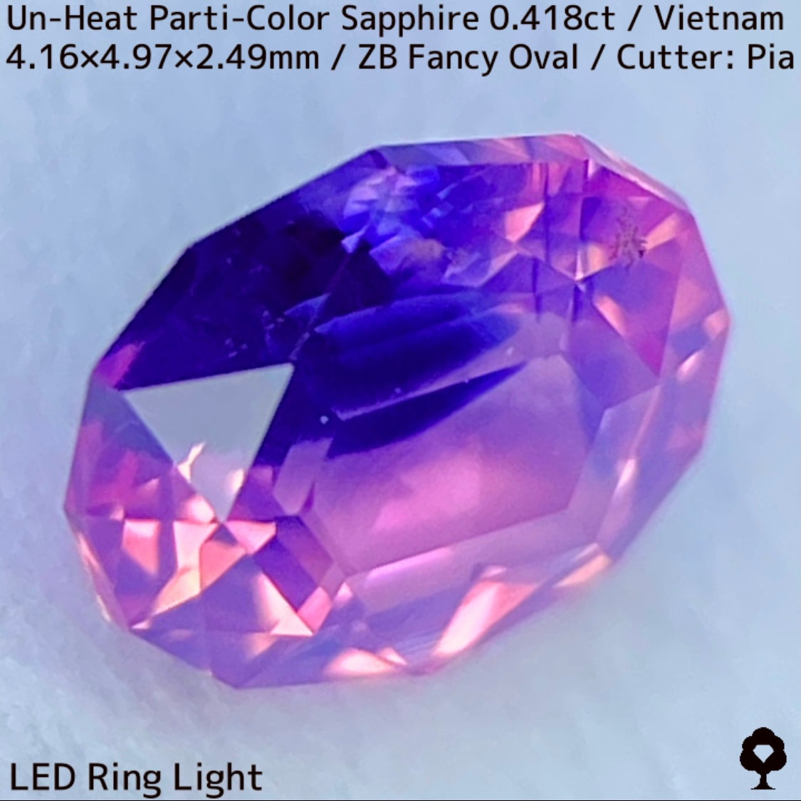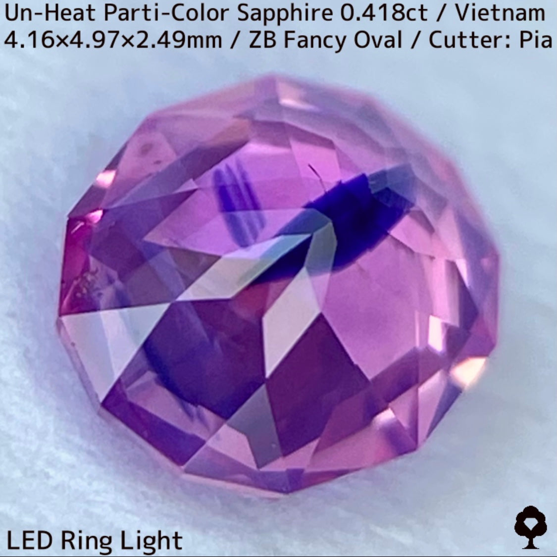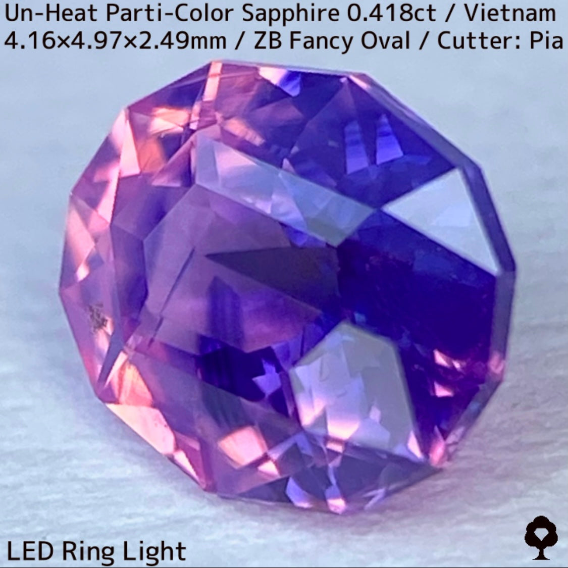 春の訪れの季節にぴったりのシルキーピンク結構のキューレットに、ブルーの色だまりがあることによって、正面から見ると全体がシルキーパープリッシュブルーになり、角度を変えて見ると色合いが動いて見える面白いベトナム産非加熱パーティカラーサファイアです。