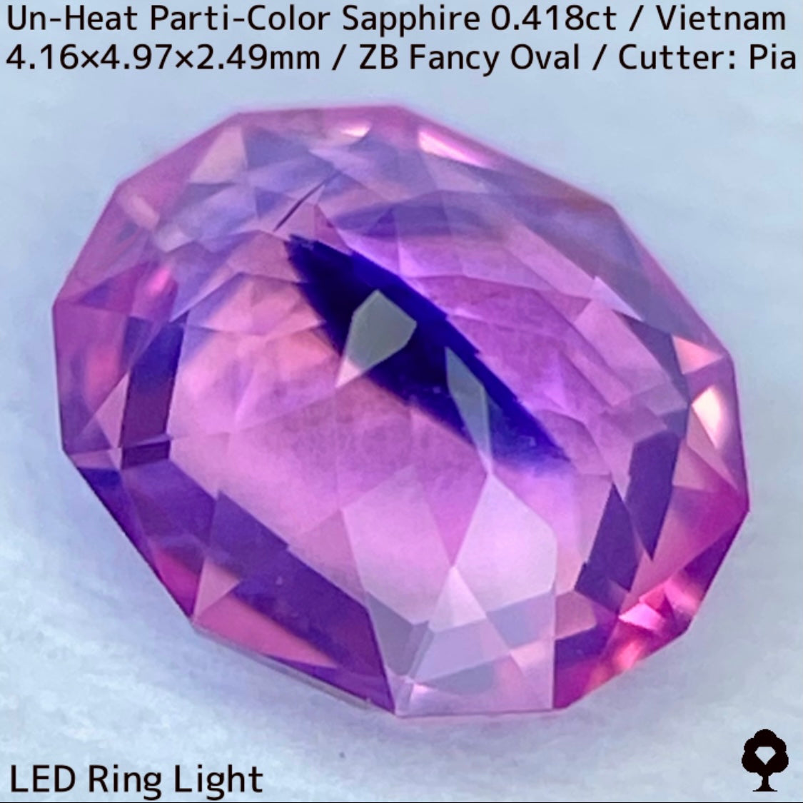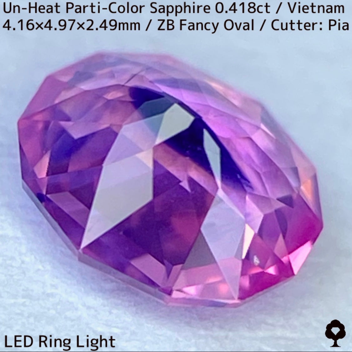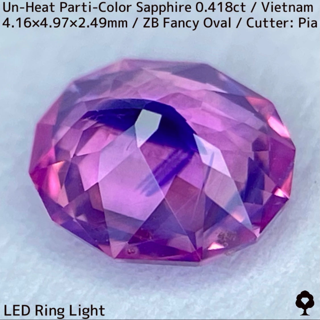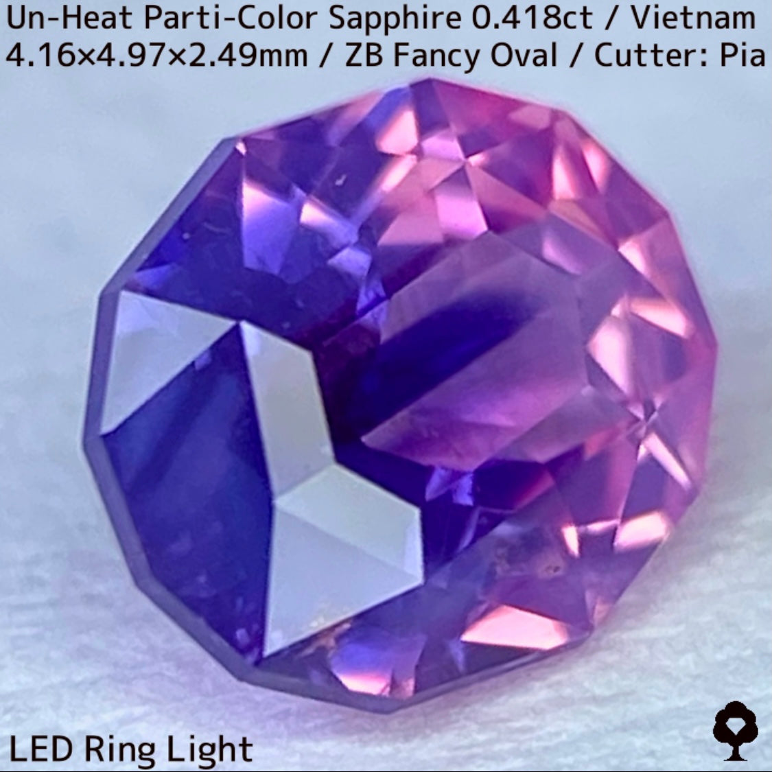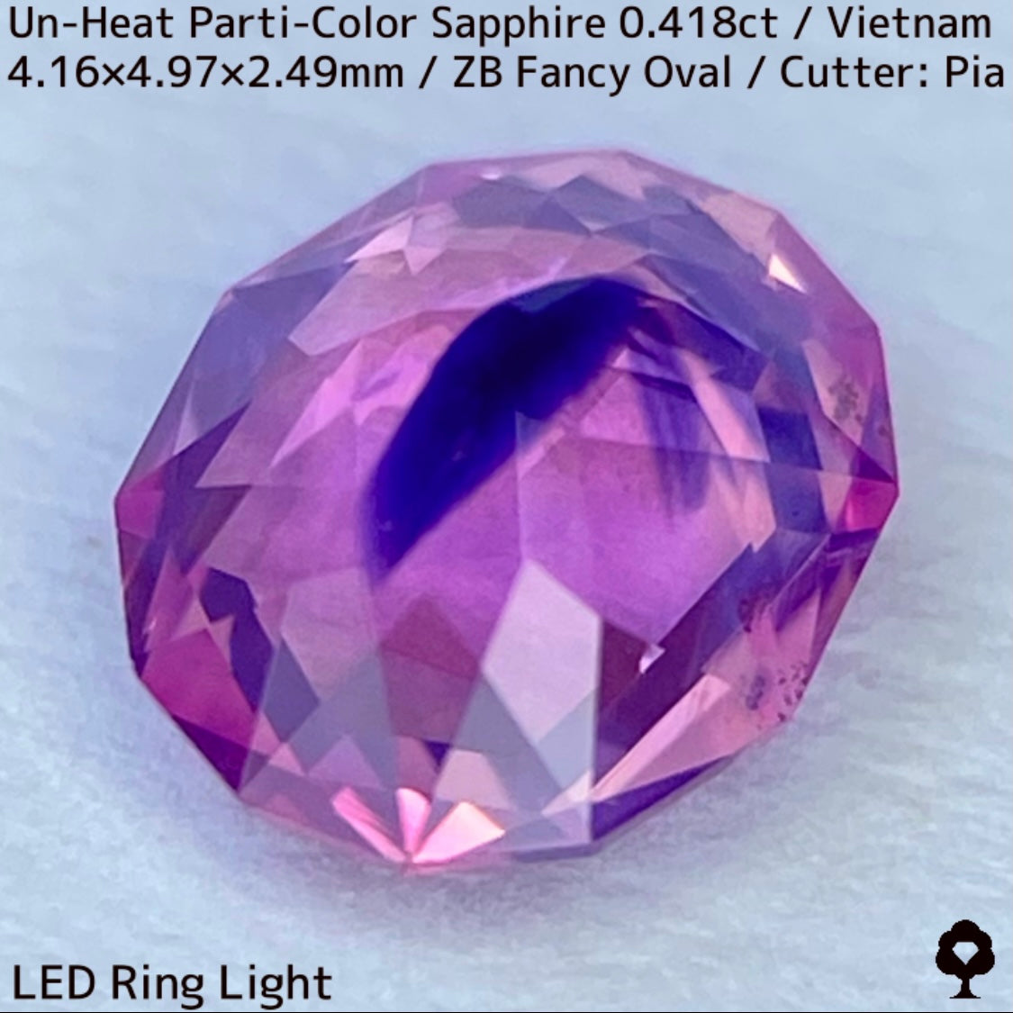 春の訪れの季節にぴったりのシルキーピンク結構のキューレットに、ブルーの色だまりがあることによって、正面から見ると全体がシルキーパープリッシュブルーになり、角度を変えて見ると色合いが動いて見える面白いベトナム産非加熱パーティカラーサファイアです。