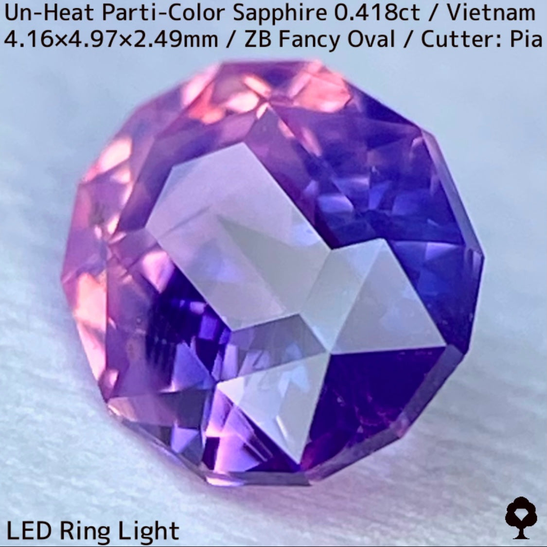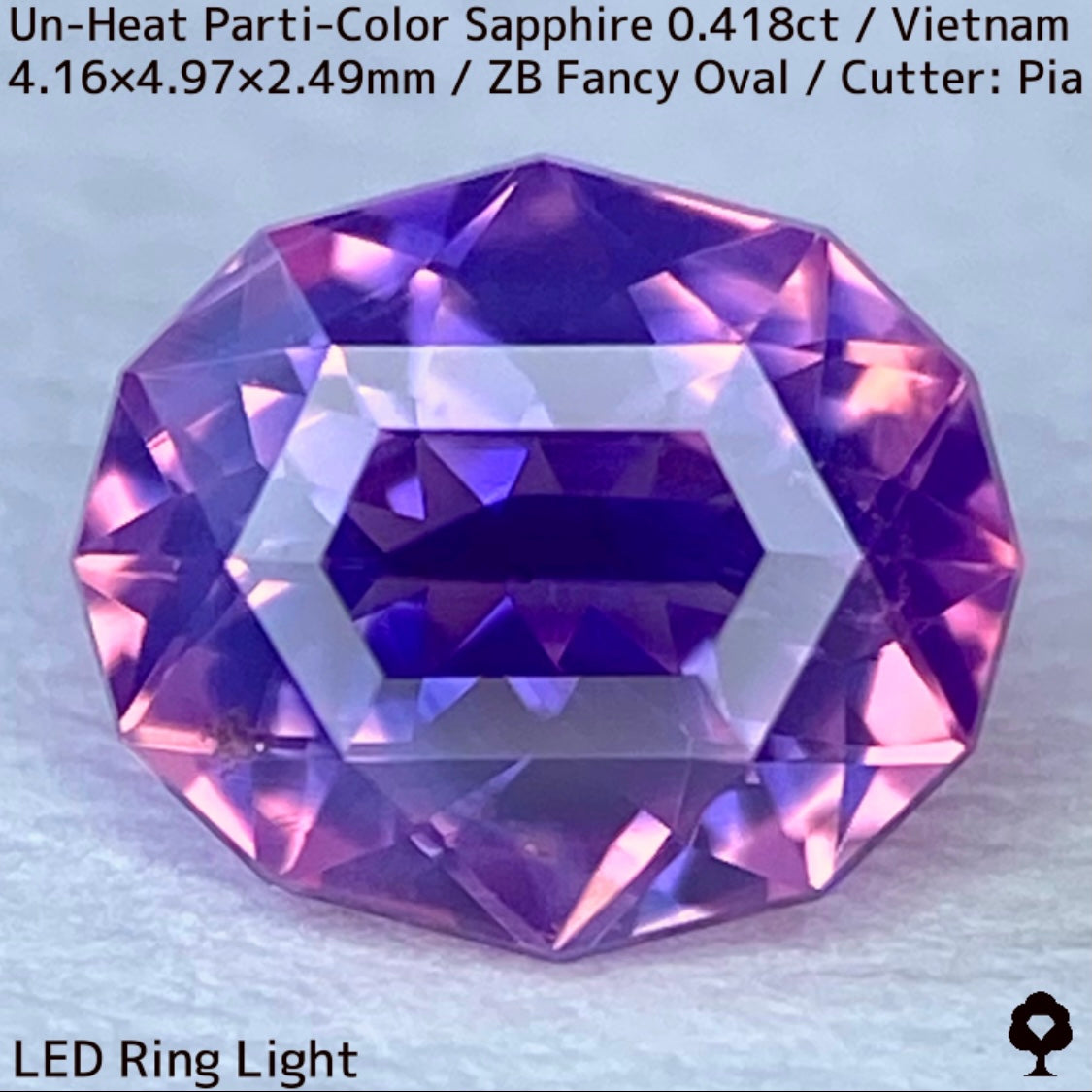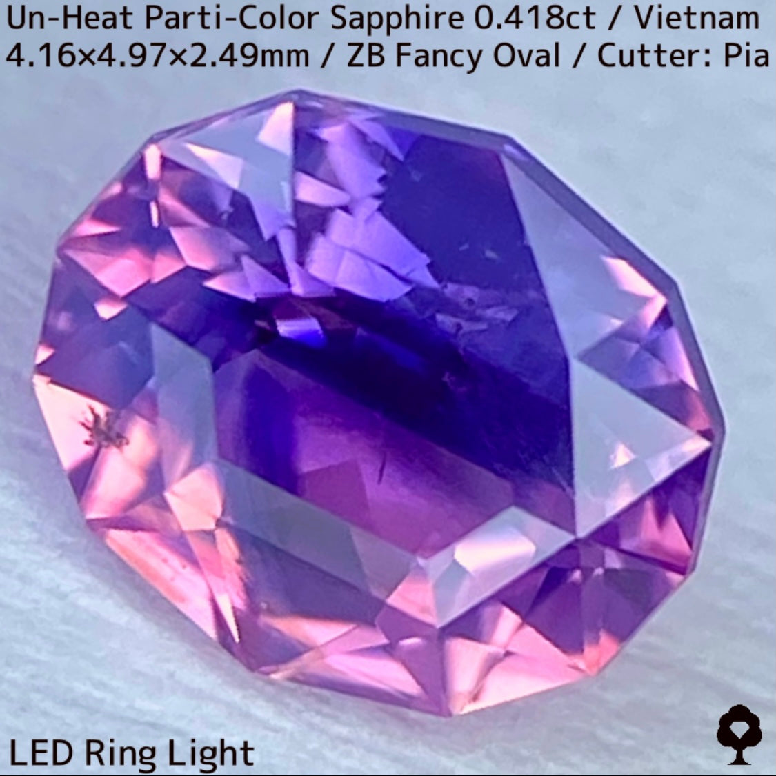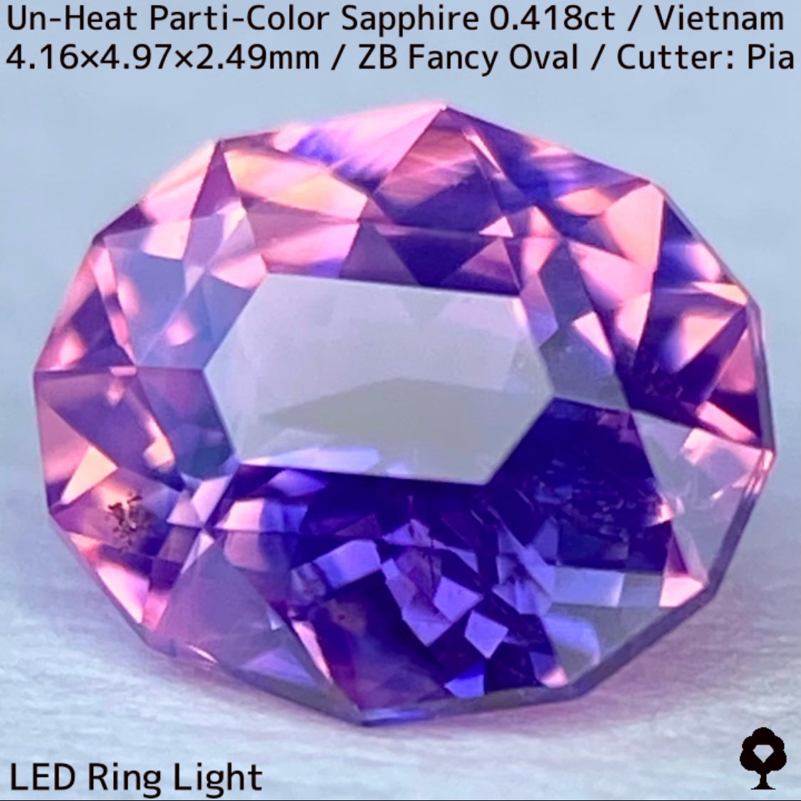 春の訪れの季節にぴったりのシルキーピンク結構のキューレットに、ブルーの色だまりがあることによって、正面から見ると全体がシルキーパープリッシュブルーになり、角度を変えて見ると色合いが動いて見える面白いベトナム産非加熱パーティカラーサファイアです。